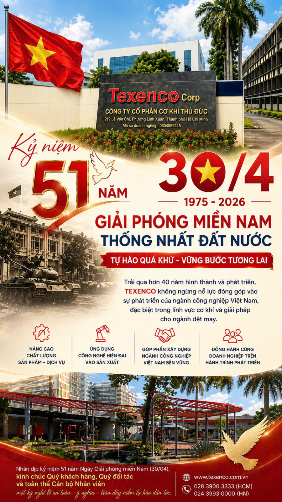 Nhân dịp ngày 30/04, TEXENCO kính chúc Quý khách hàng, Quý đối tác và toàn thể cán bộ nhân viên một kỳ nghỉ an toàn, ý nghĩa và tràn đầy niềm tự hào dân tộc.